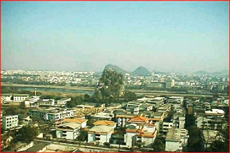 Z pokoje máme dosud nejhezčí výhled. Zčásti sice vidíme, hned pod balkonovým výklenkem, do dvou-tří dvorů obytných domů, kde podle nás zřejmě bydlí hlavně personál hotelu, za dvory je vidět zčásti na hlavní třídu, v pozadí je krásný výhled na typické strmé kopce dodávající okouzlující romantický ráz kraji kolem Kuejlinu.
