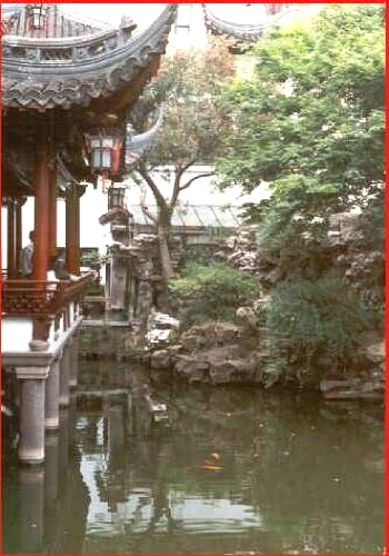 Náš program pokračuje návštěvou šanghajské zahrady Yuyuan, která je situována vprostřed zóny mnoha krámků a obchodů. Vchod je oproti krásné čajovně s lomeným, nádherně zdobeným úzkým můstkem (znovu ochrana proti zlým duchům), vše obklopeno malým jezerem s rozkvetlými lotosy.